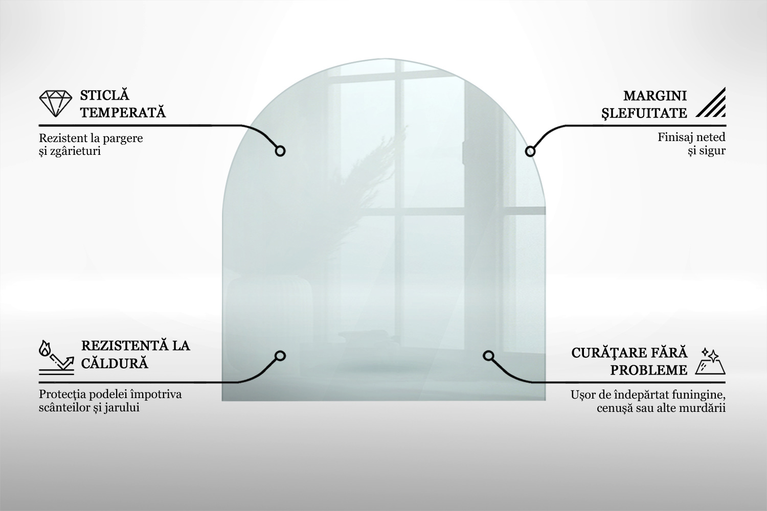 Sticlă sub șemineu transparent este un frumos element decorativ care va aduce un aspect modern și elegant interiorului tău. Designul minimalist îl face să se potrivească perfect în aproape orice aranjament - atât în interioarele moderne, cât și în cele clasice. Suprafața transparentă reflectă subtil lumina, adăugând confort și un pic de strălucire oricărei încăperi cu șemineu. Alegeți această combinație de funcționalitate și estetică. Alegeți o completare practică și frumoasă a spațiului. Designul estetic in forma semicirculara este extrem de modern si elegant.